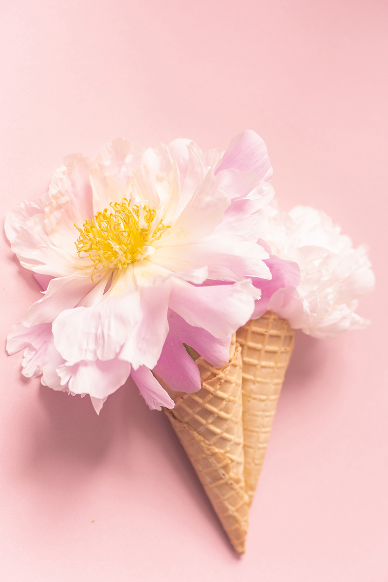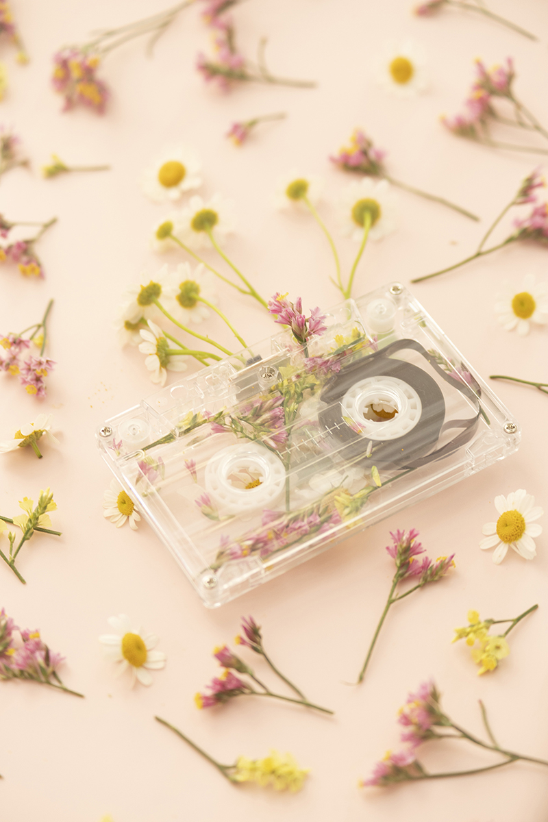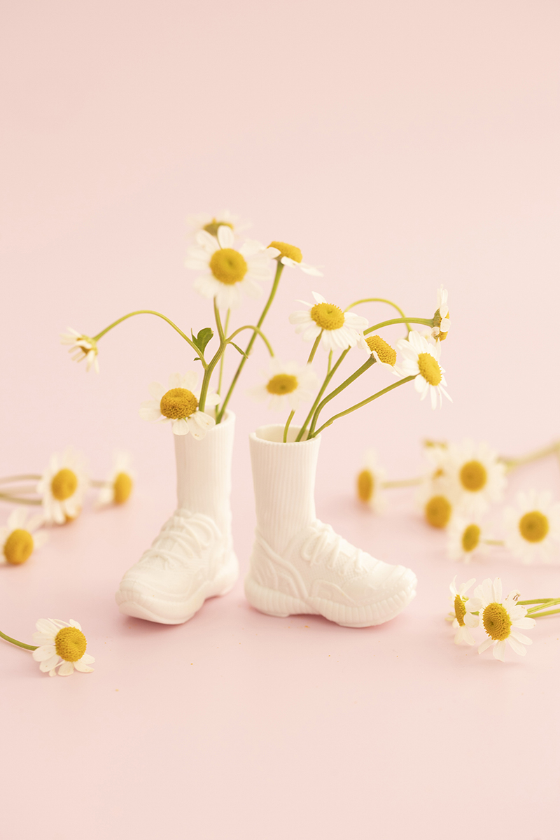 Dans cette série intitulée Domestic Bloom, j’ai choisi d’introduire les fleurs là où on ne les attend pas, dans des objets du quotidien détournés de leur fonc-tion première : un cornet de glace, une cassette audio, et des objets miniatures comme une paire de chaussures ou encore une baignoire de poupée.